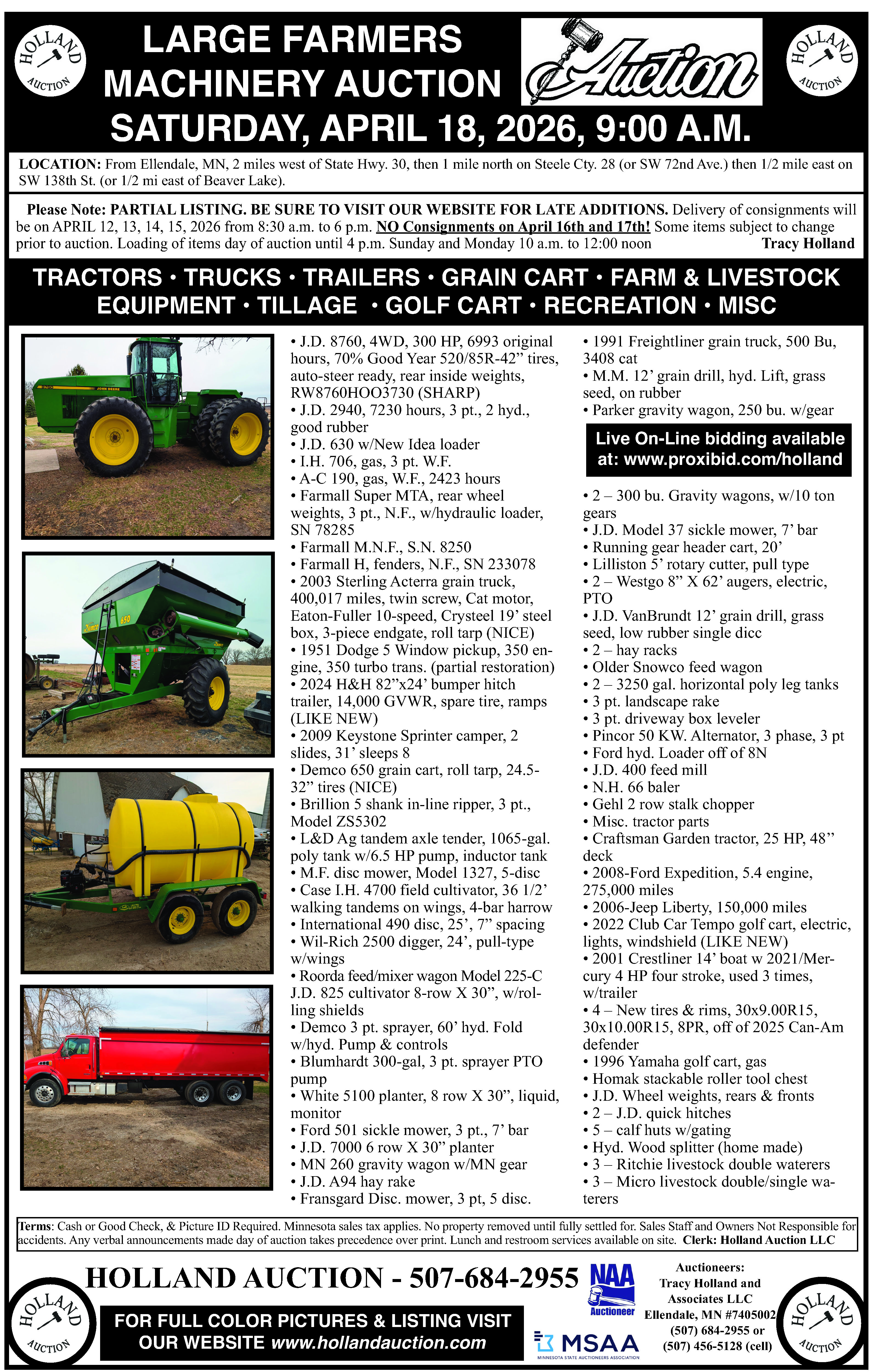 Please Note: PARTIAL LISTING. BE SURE TO VISIT OUR WEBSITE FOR LATE ADDITIONS. Delivery of consignments will be on APRIL 12, 13, 14, 15, 2026 from 8:30 a.m. to 6 p.m. NO Consignments on April 16th and 17th! Some items subject to change prior to auction. Loading of items day of auction until 4 p.m. Sunday and Monday 10 a.m. to 12:00 noon - Tracy Holland